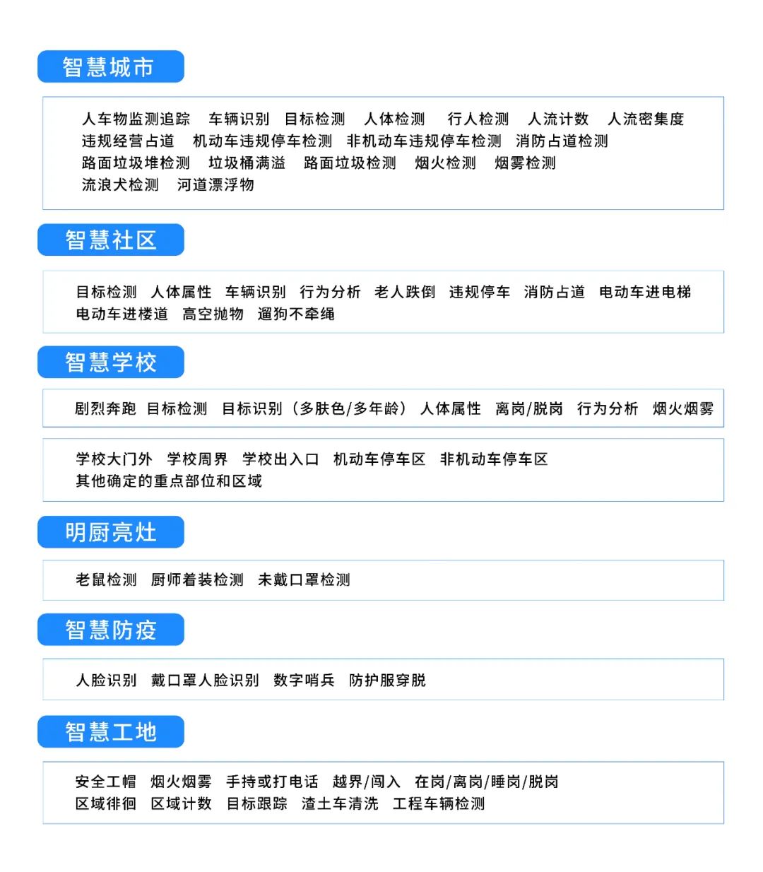 基于視頻智能分析算法,MG800 可提取視頻中人員、物品、行為、事件等要素,對視頻流進行智能化、標(biāo)簽化分析,告警異常事件,預(yù)防潛在風(fēng)險。算法涵蓋智慧城市、智慧社區(qū)、智慧學(xué)校、明廚亮灶、智慧防疫、智慧工地等,可對城市運行、基層治理、城市管理、行政執(zhí)法中的多種場景進行智能識別。