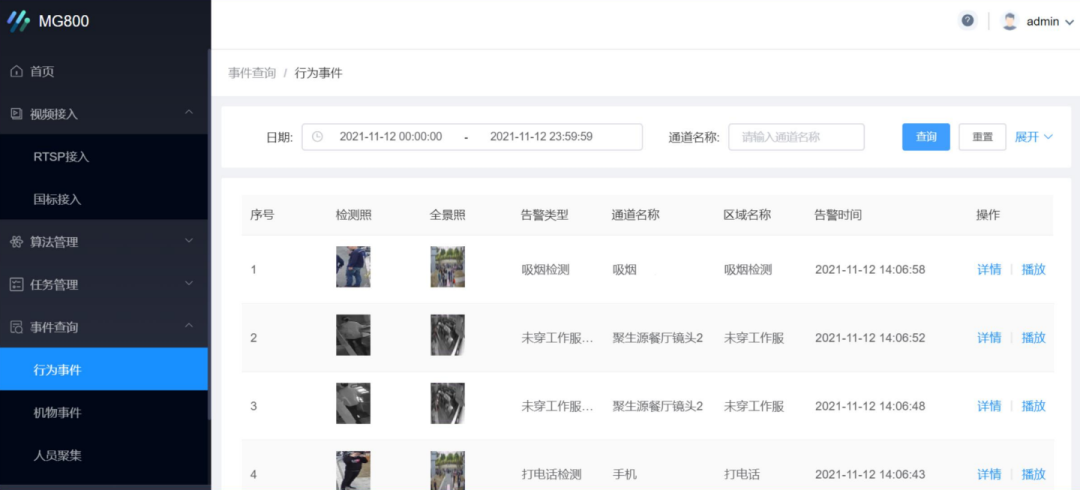 MG800可記錄告警事件,支持查看視頻回放,以便管理者進行事件定位、追蹤溯源。在市政管理、社區(qū)、園區(qū)、工地等場景下,安全防控由被動監(jiān)控轉(zhuǎn)為主動發(fā)現(xiàn),形成“預(yù)警、調(diào)度、處置、決策”的城市管理全閉環(huán)。