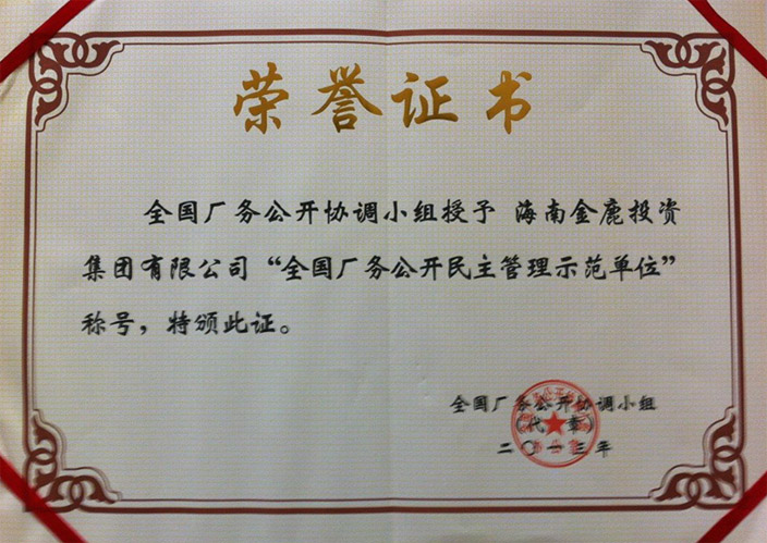 10月28日,金鹿集團(tuán)公司被全國(guó)廠務(wù)公開協(xié)調(diào)小組授予“全國(guó)廠務(wù)公開民主管理示范單位”榮譽(yù)稱號(hào),是海南省兩個(gè)示范單位之一。